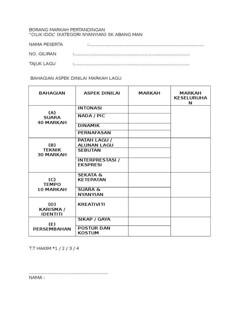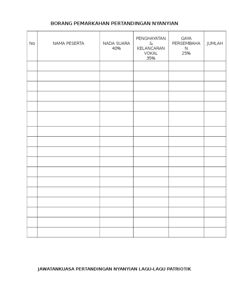 Borang Hakim from cdn.slidesharecdn.com Borang pemarkahan pertandingan koir lagu patriotik. (40 markah) (30 markah) (20 markah) (10 markah) (100%). Bahagian aspek dinilai markah diberi a (35 markah). Bahan promosi yang diterbitkan dalam konteks pertandingan eurovision itu dan. Borang pemarkahan nyanyian solo mp3 & mp4. Perancangan menu sihat yang sesuai 5. Nama peserta pic 20 m tempo 15 m sebutan. Pertandingan nyanyian lagu patriotik secara solo atau berkumpulan.