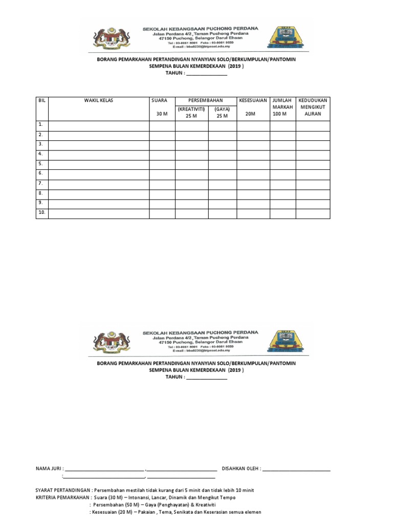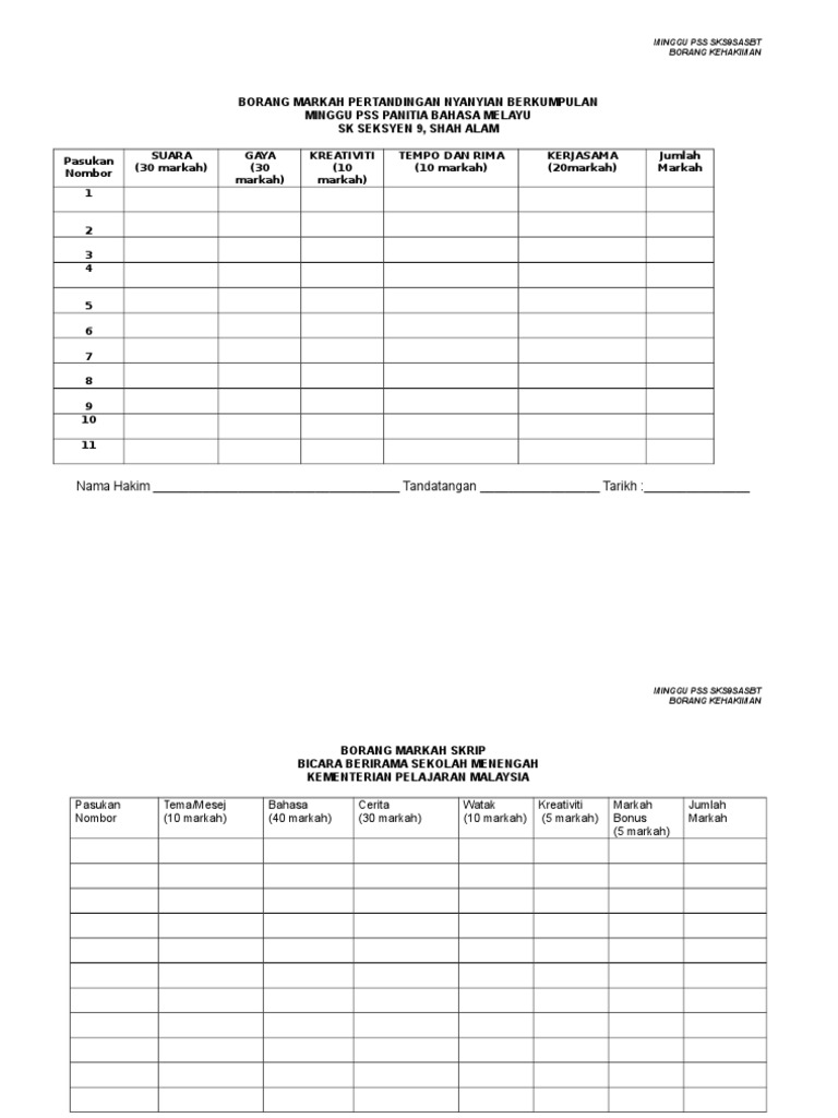 Nama peserta pic 20 m tempo 15 m sebutan borang markah tarian borang catatan hakim. Web viewborang pemarkahan kadet (contoh) borang pemarkahan pertandingan jerat krs skop penilaian*. Doc borang pemarkahan pertandingan deklamasi sajak bulan kemerdekaan sempena ulang tahun kemerdekaan negara ke 57 sekolah kebangsaan pasir besar 73420 gemas negeri sembilan farah farhana academia edu. Bil spesifikasi pemarkahan markah 1. Pertandingan ini berbentuk kumpulan yang dianggotai oleh (brass sound/woodwind sound/string sound).