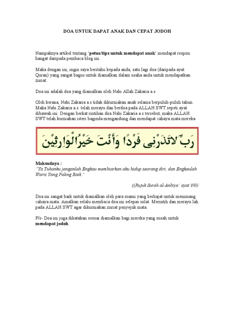 Sesungguhnya, engkau sentiasa mendengar (menerima) doa permohonan. ini adalah doa nabi zakaria yang memohon kepada allah swt agar dikurniakan zuriat yang baik untuk kelangsungan dakwahnya. Tapi kalau sampai sekarang anda, pasangan atau. Namun, tidak semua pasangan suami isteri beroleh zuriat setelah berkahwin. Melalui perkahwinan, manusia akan dapat mengembangkan keturunan dan memenuhi ketenteraman jiwa kerana perkahwinan yang harmoni dan sesuai menurut tuntutan ilahi, dapat memenuhi tuntutan biologi. Apapun ujian yang melanda dalam perkahwinan kalian jangan pernah mengalah untuk mendapatkan zuriat tapi teruslah berusaha dan berdoa untuk mencapai impian anda itu.